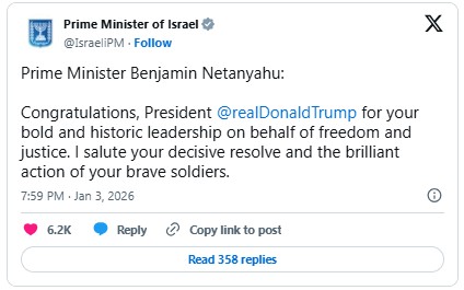 “Congratulations, President Donald Trump for your bold and historic leadership on behalf of freedom and justice. I salute your decisive resolve and the brilliant action of your brave soldiers,” the Prime Minister’s Office said on X.