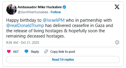 “Happy birthday to Netanyahu, who, in partnership with President Donald Trump has delivered ceasefire in Gaza and the release of living hostages & hopefully soon the remaining deceased hostages,” he stated.