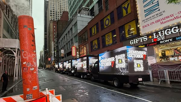 The ads and trucks display the message in English: “Remember October 7”, along with a QR code linking (available abroad only) to a website showing the atrocities of October 7.