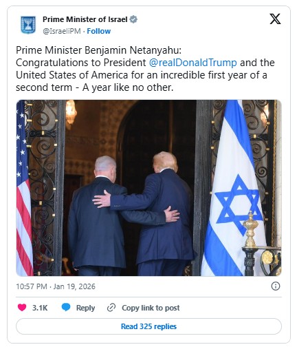 “Congratulations to President [Trump] and the United States of America for an incredible first year of a second term—A year like no other,” Netanyahu wrote on X, sharing a photo of the two from their recent meeting at Trump’s Mar-a-Lago resort in Florida.