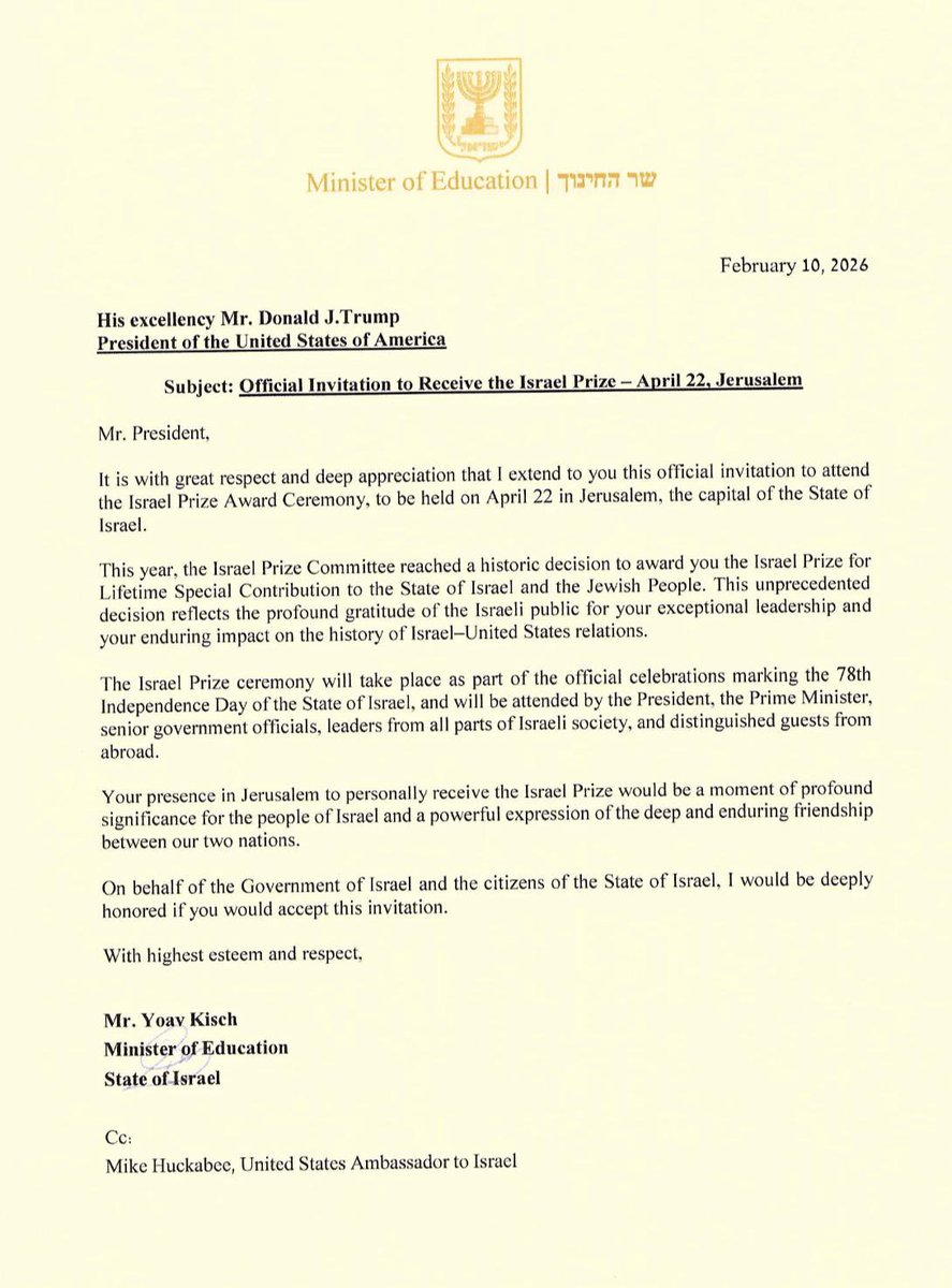 The Minister of Education Yoav Kisch sent an official invitation on Tuesday to the President of the United States, Donald Trump, to participate in the Israel Prize ceremony to be held on the 78th Independence Day in Jerusalem. The invitation was sent following the decision to award President Trump the Israel Prize in the category of "Unique Contribution to the Jewish People."