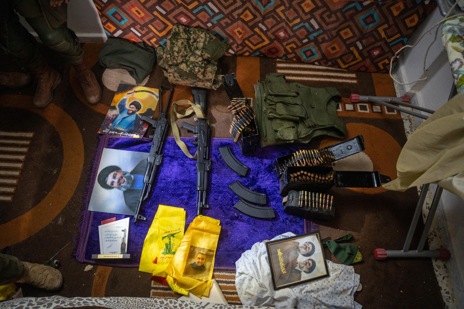 During searches in the area, several weapons belonging to Hezbollah were located inside a civilian home, including Kalashnikov rifles, magazines, and military vests.