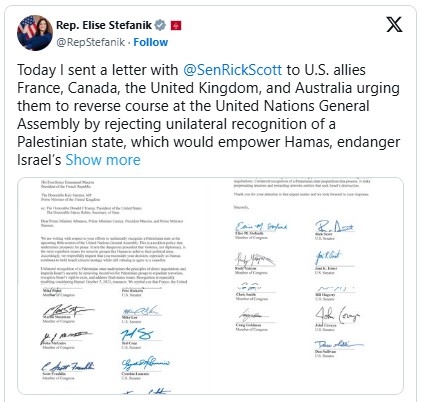 (Sept. 21, 2025 / JNS) Republican Rep. Elise Stefanik (R-N.Y.) announced on Friday that she had sent a letter to U.S. allies France, Canada, the United Kingdom and Australia, “urging them to reverse course at the United Nations General Assembly by rejecting unilateral recognition of a Palestinian state.”