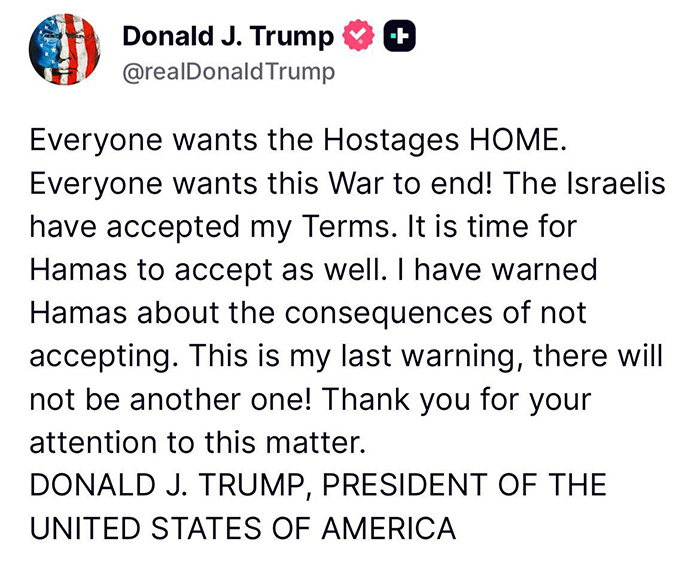 Trump emphasized this was Hamas’s final chance to comply, writing: “I have warned Hamas about the consequences of not accepting. This is my last warning, there will not be another one!” He signed the message as “President of the United States of America,” underscoring the weight of his ultimatum.