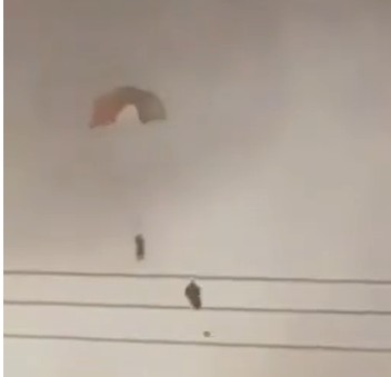 The footage depicts a fighter jet descending with visible flames or smoke from its rear, followed by what appears to be an ejection sequence and the aircraft spiraling downward.