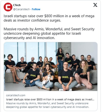 (Nov. 18, 2025 / JNS) Israeli startups pulled in more than $800 million over the past week, led by mega-rounds in cybersecurity and artificial intelligence, Israeli business outlet Calcalist reported on Thursday.